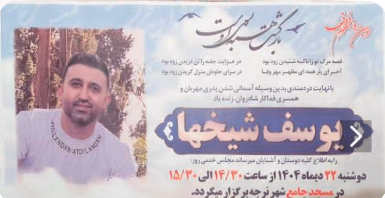 Name Yousef Sheikhha Location Narjeh, Qazvin Province, Iran Date of Birth: 33 years old Date of Incident January 9, 2026 (Gregorian) Report According to received reports, Yousef Sheikhha was present during the protests in the city of Narjeh, in front of the Basij base. At the time he stepped forward to assist a 17-year-old who had been shot, he was struck from behind by a military bullet. These reports indicate that the shot was fired from the rooftop of the base by one of the Basij forces, and the bullet struck his heart, leading to his death. Witnesses reported that Yousef Sheikhha fell face down after being shot and died in the arms of one of his companions. The texts emphasize that he was unarmed and played no role in the conflict, having only stepped forward to save the life of an injured teenager. He is remembered as the first casualty of the city of Narjeh during the national uprising. According to available information, Yousef Sheikhha's body was handed over to his family on January 11, 2026, after obtaining a commitment regarding the time of burial, and he was buried at 7 AM. According to reports from relatives, the family was not allowed to hold a mourning ceremony in the mosque or cemetery, and any expression of grief and sounds of crying were silenced under threats from the authorities. It was also noted that he had a three-year-old child. Sources: Social Media